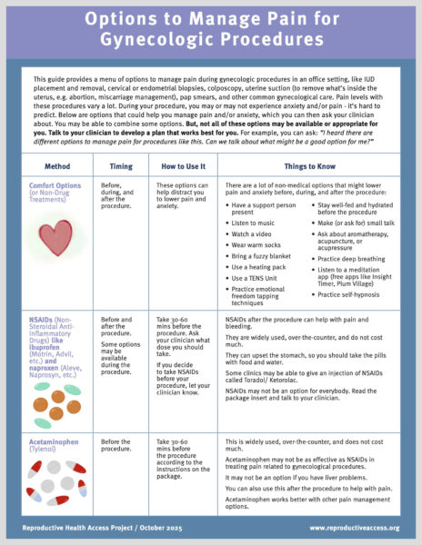 This fact sheet offers patients and clinicians a menu of options to manage pain during gynecologic procedures in an office setting, like IUD placement and removal, cervical or endometrial biopsies, colposcopy, uterine suction (e.g. abortion, miscarriage management), pap smears, and other common gynecologic care. Methods include: comfort options, non-steroidal anti-inflammatory drugs like ibuprofen and naproxen, anti-anxiety medications, cervical block, and more. Not all of these options may be available or appropriate for you. Use this guide to learn about options that could help manage pain and/or anxiety. Talk to your clinician to develop a plan that works best for you. Clinicians can use this resource to start a conversation with their patients about pain management. Created by Miriam Rienstra-Bareman, MD. Acknowledgements: Taylor Stanton, MD and Taylor Knowles, MD